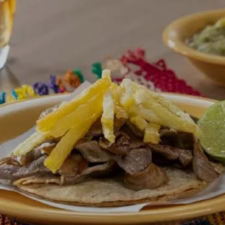 Taco de adobada, acompañado de papas nopales y cebolla; incluye limones y salsa