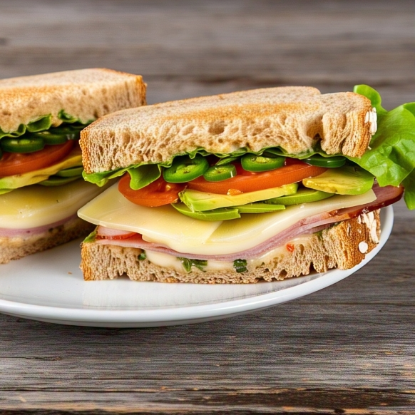 Pan integral, mayonesa, jamon, queso manchego, lechuga, jitomate, aguacate, jalapeños