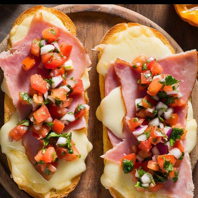 2 piezas de pan blanco crujiente con frijoles refritos, queso manchego y jamón, acompañado con el tradicional pico de gallo