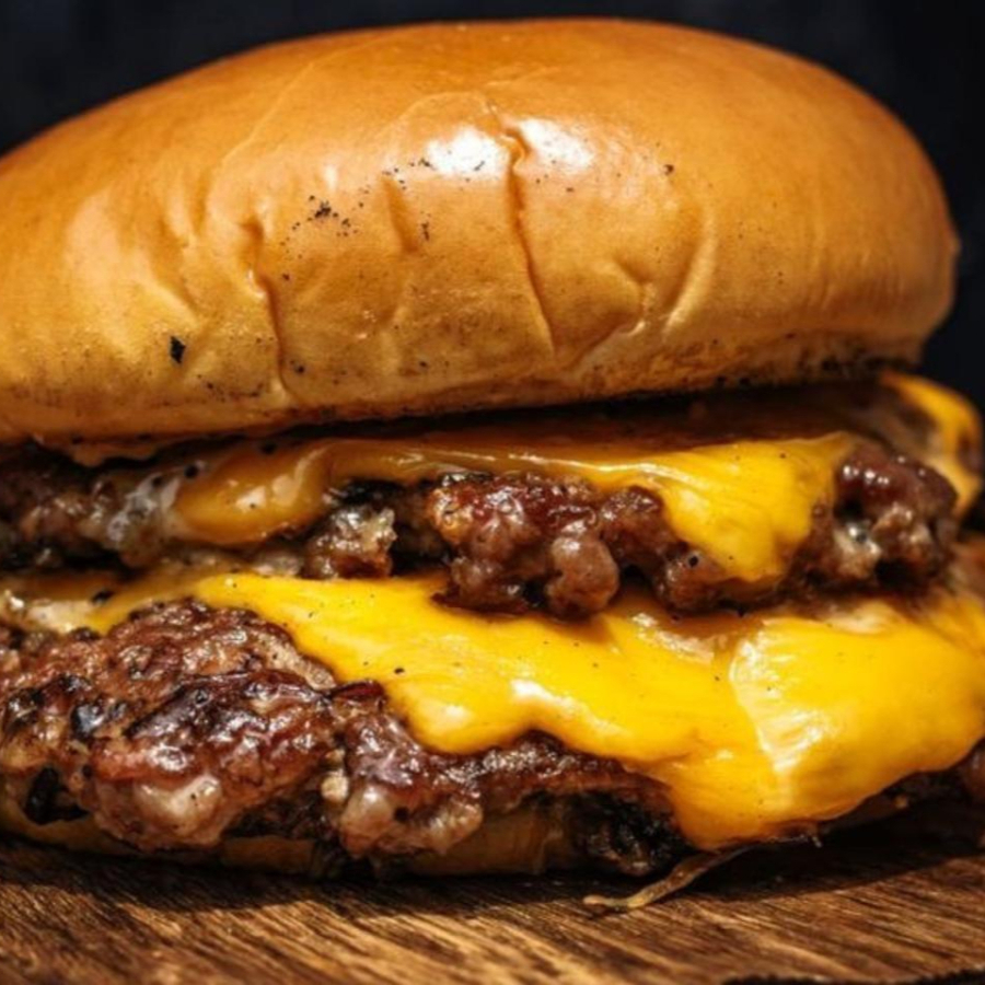 Hamburguesa doble con pan de papa, doble carne Angus certificada con queso americano y aderezo de la casa + pepinillos, jalapeños y ketchup