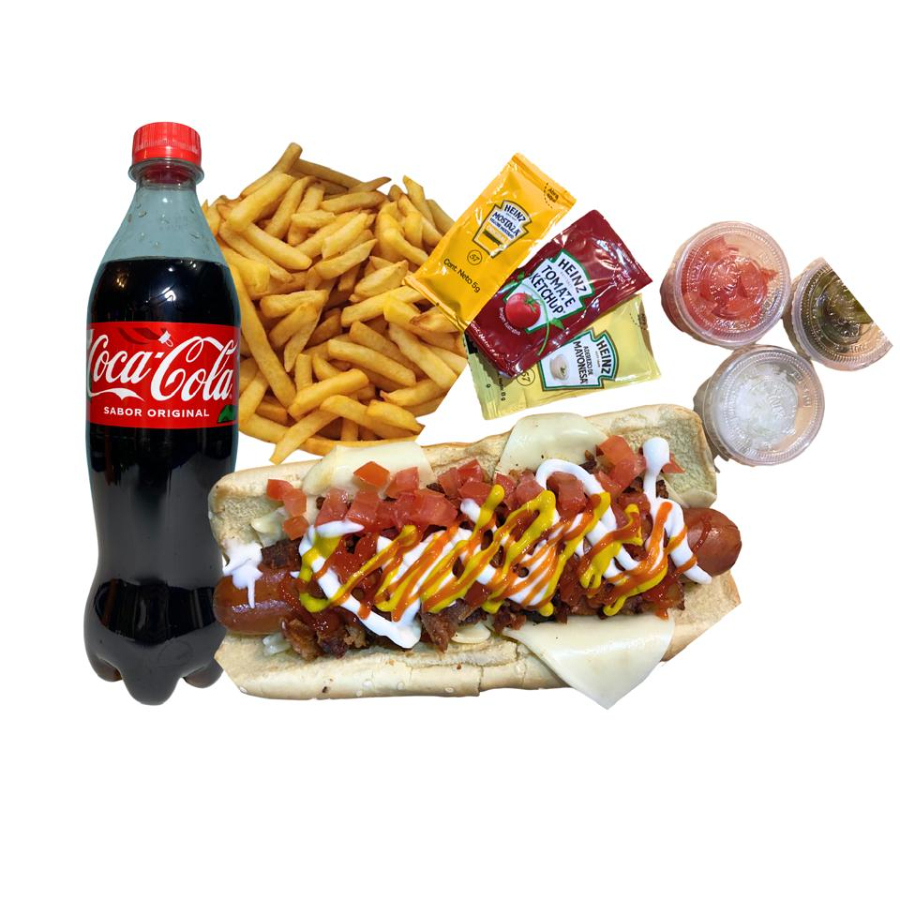 Hot Dog grande, 20cm de salchicha de carne de res premium + papas y refresco a elegir