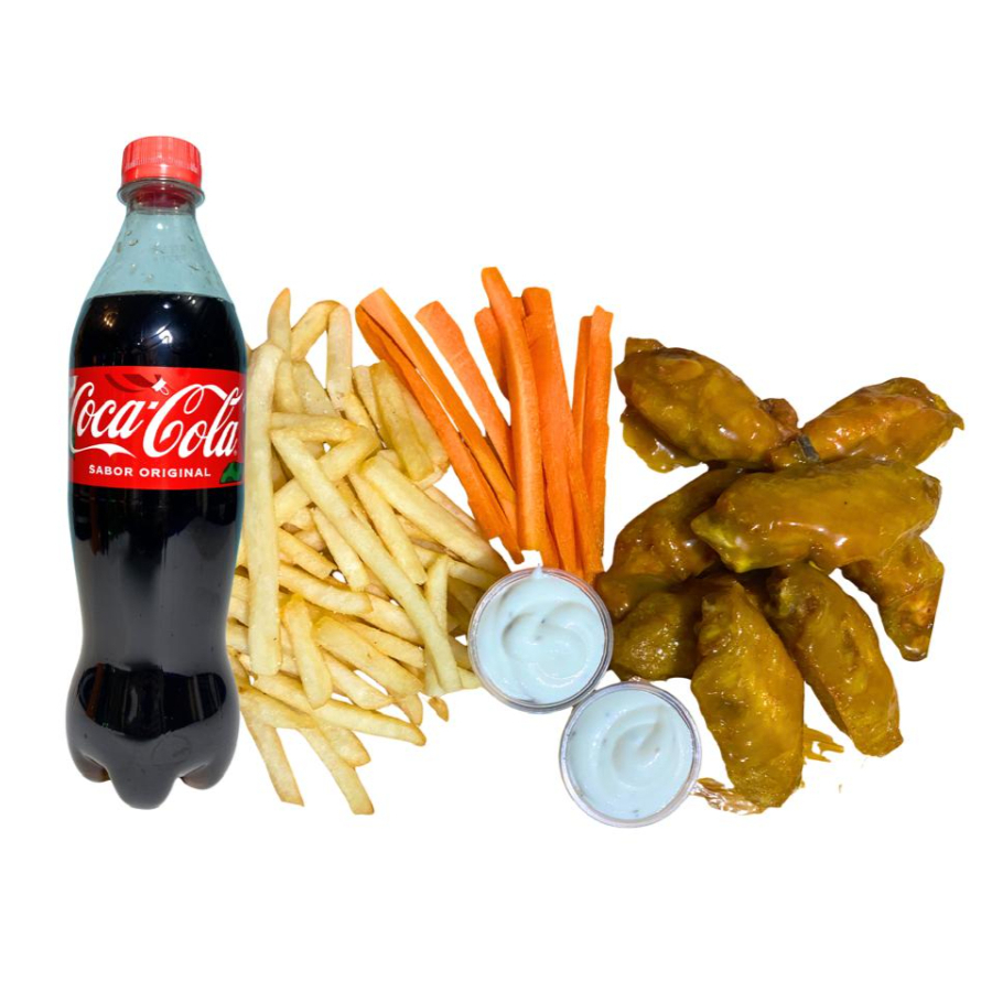 20 alitas + papas y refresco