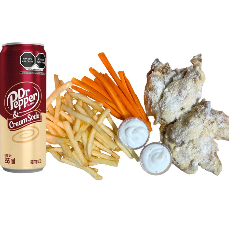 12 alitas + papas y refresco a elegir
