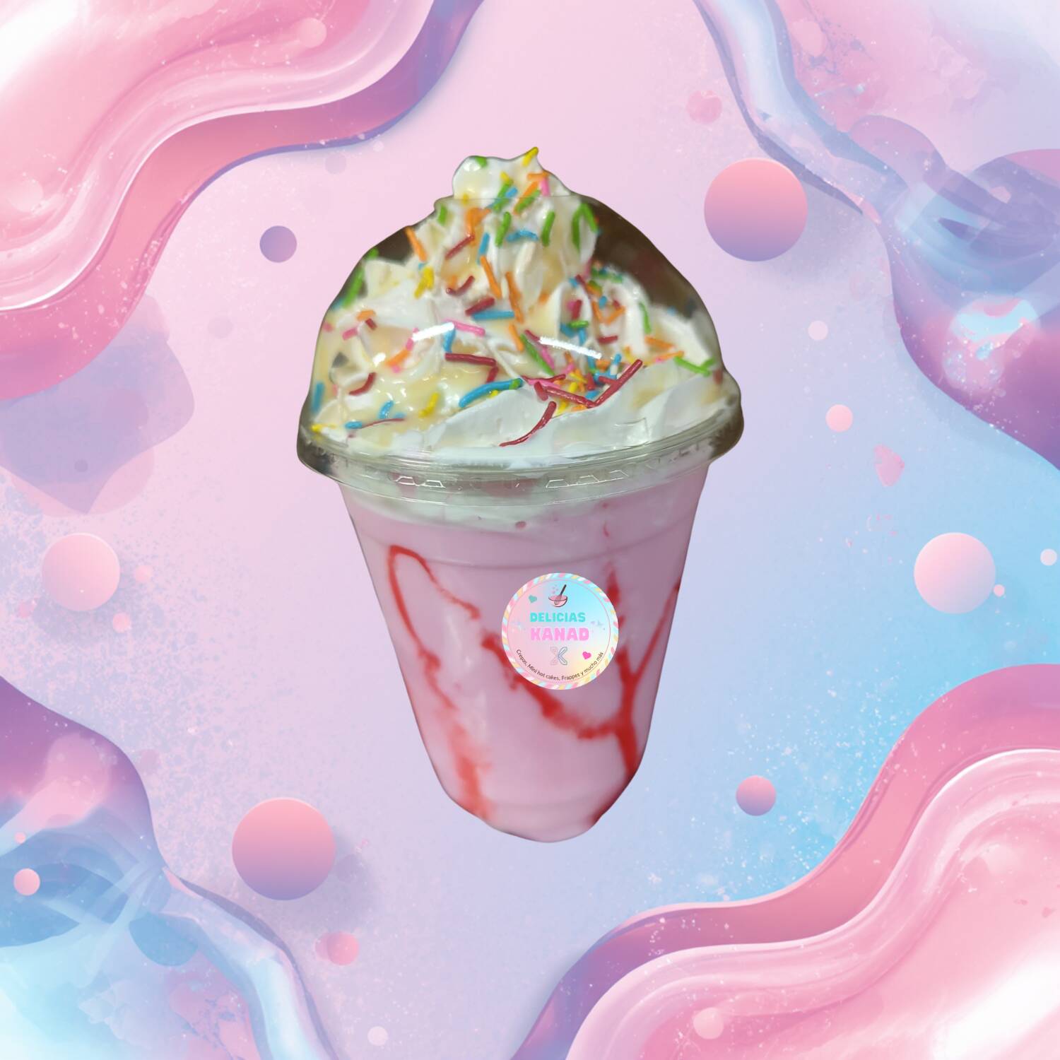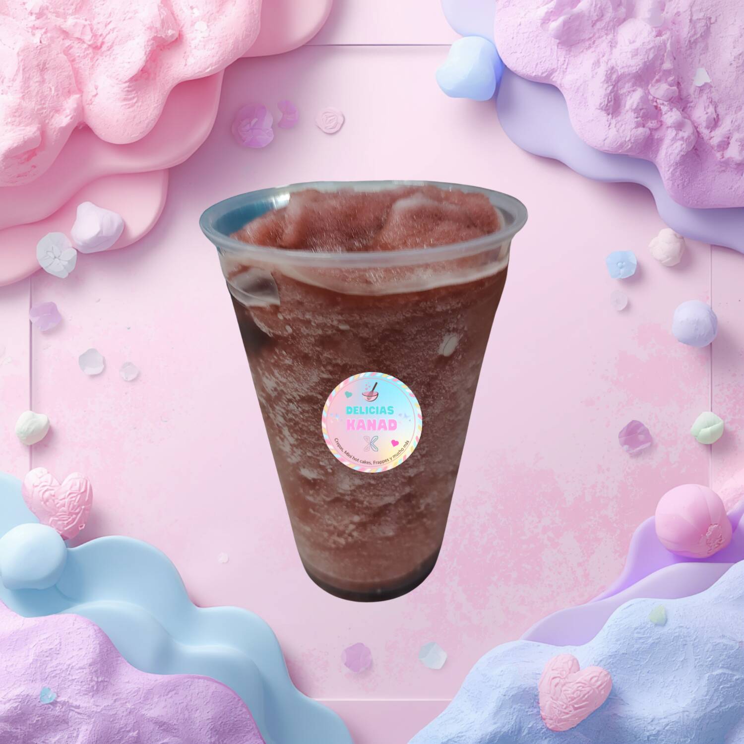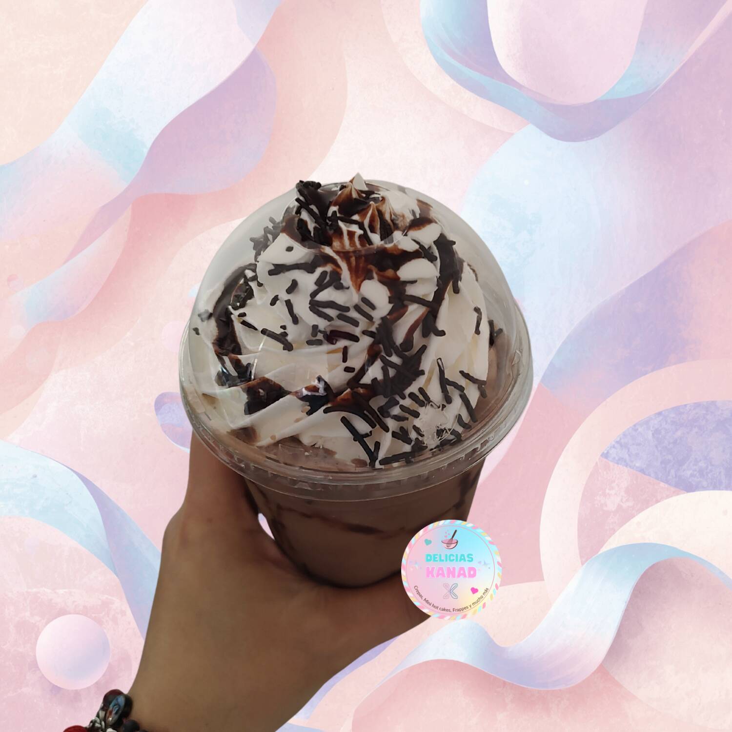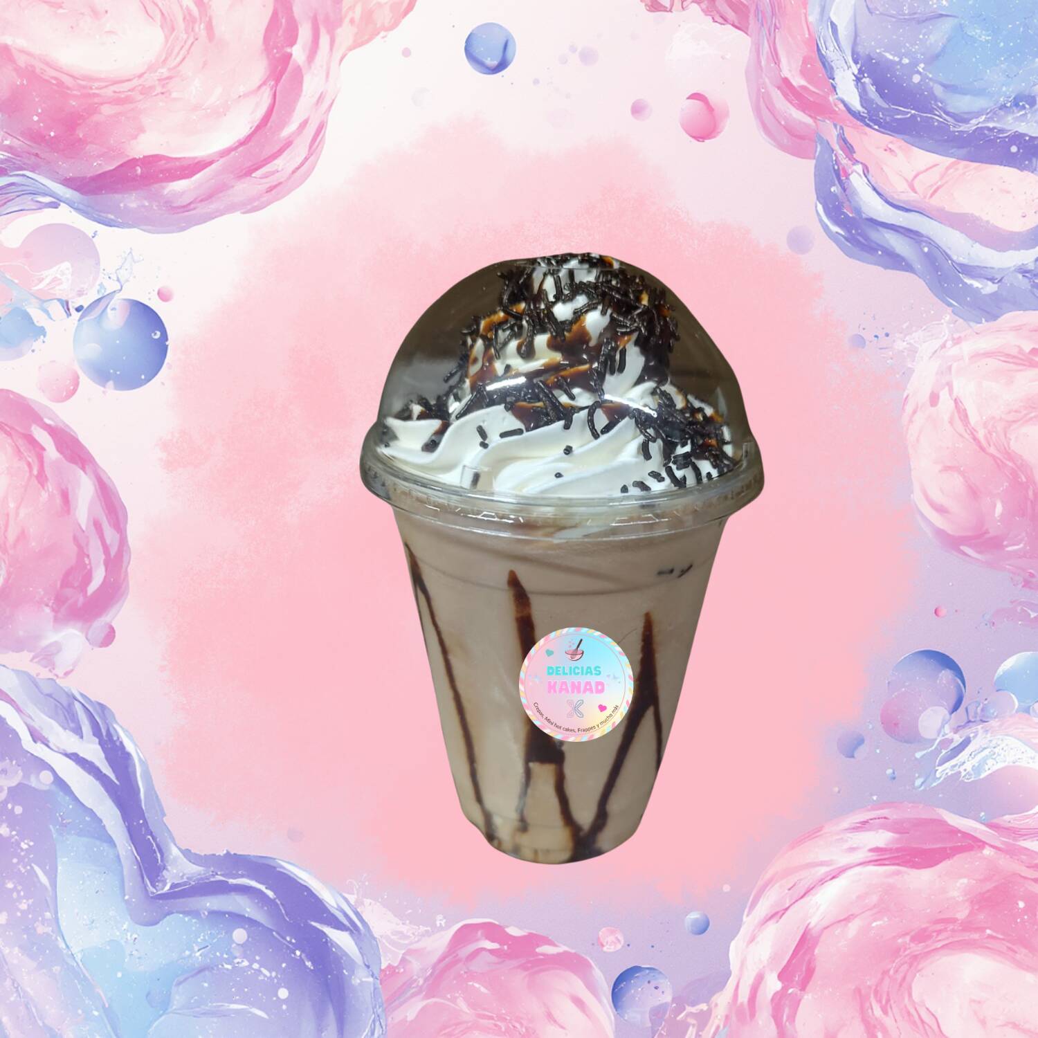 Frappé de 12 oz. con crema batida y sabor, topping líquido y y crocante a elegir