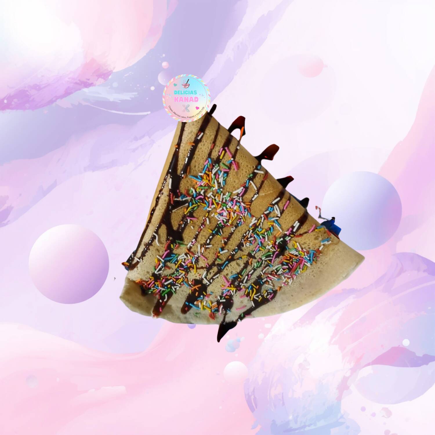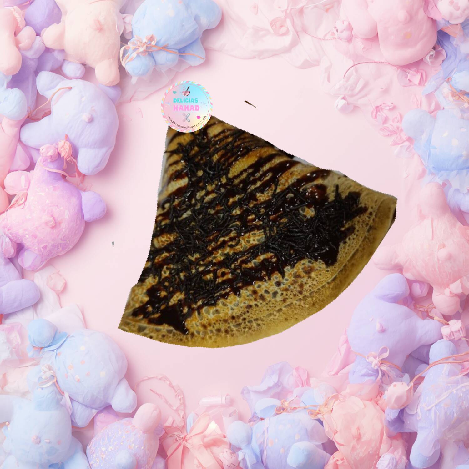 Crepa de 40 cm de diámetro, doblada en triángulo, con sabor, granillo a elegir y topping líquido a elegir.