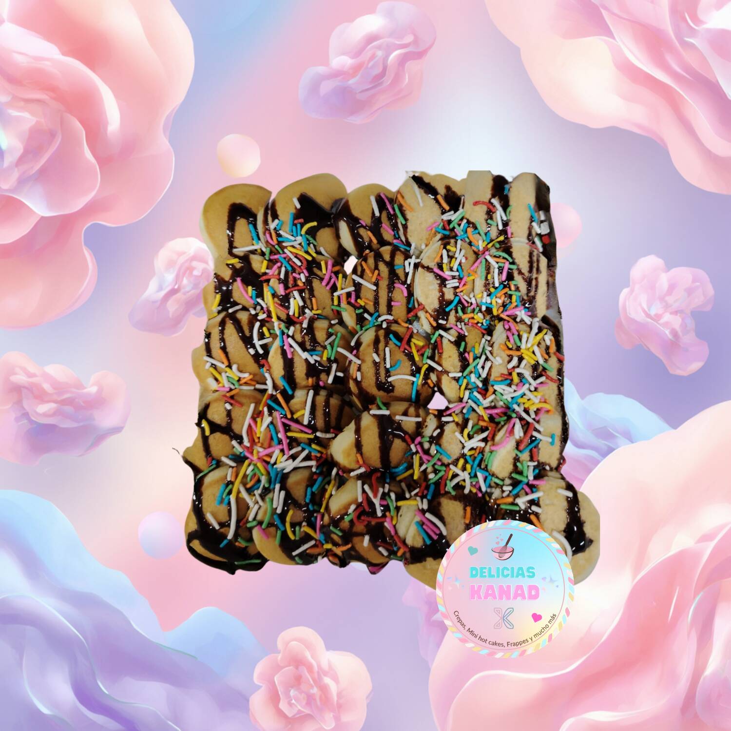 15 deliciosos mini hot cakes bañados con topping liquido y granilloa elegir