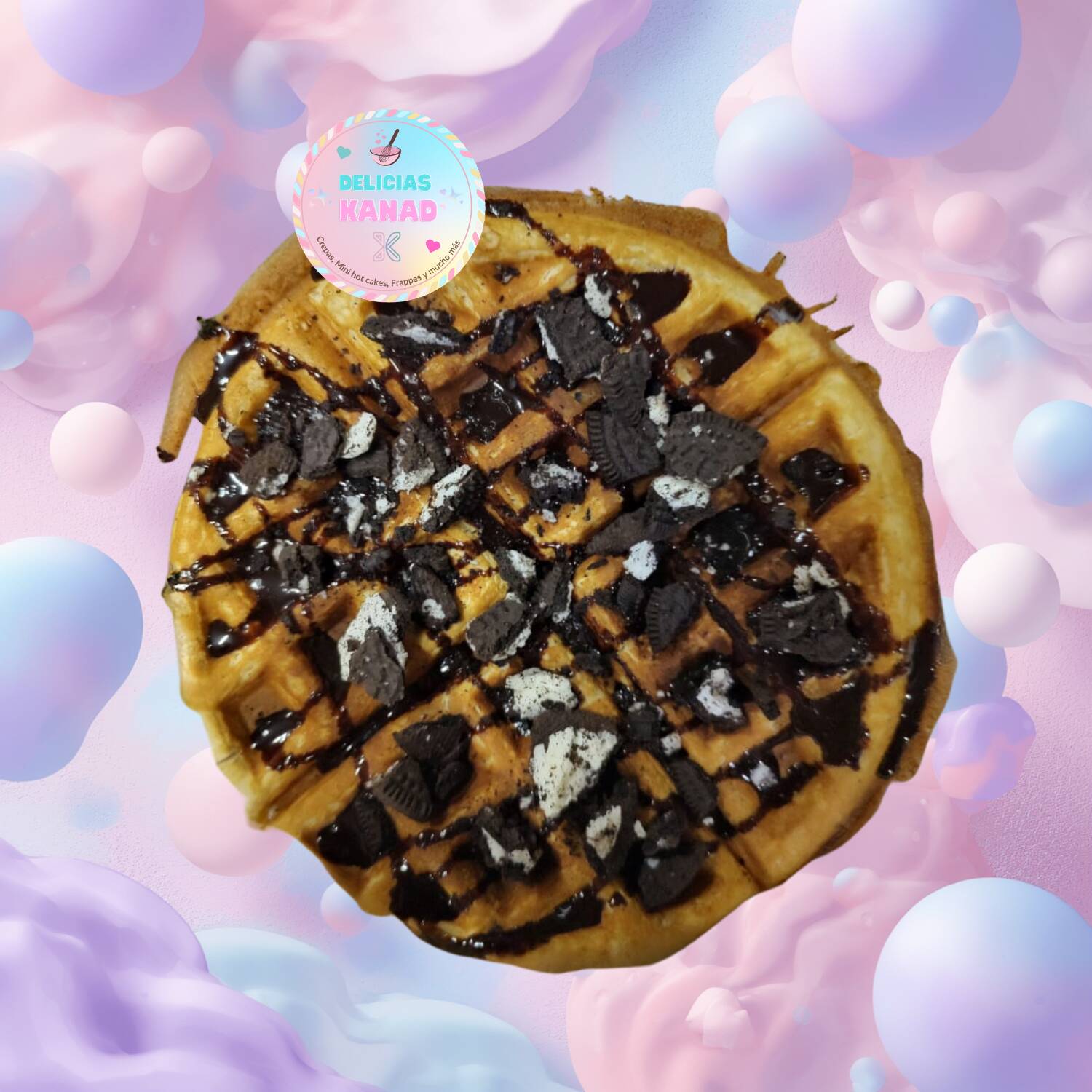 Waffle completo con topping líquido y con topping crocante a elegir