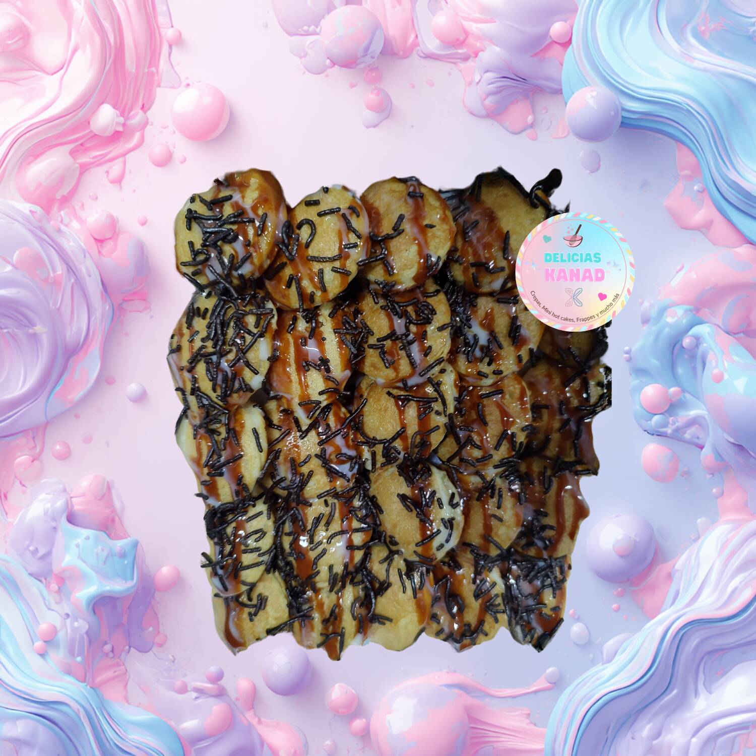 25 mini hotcakes bañados con topping liquido y granillo a elegir