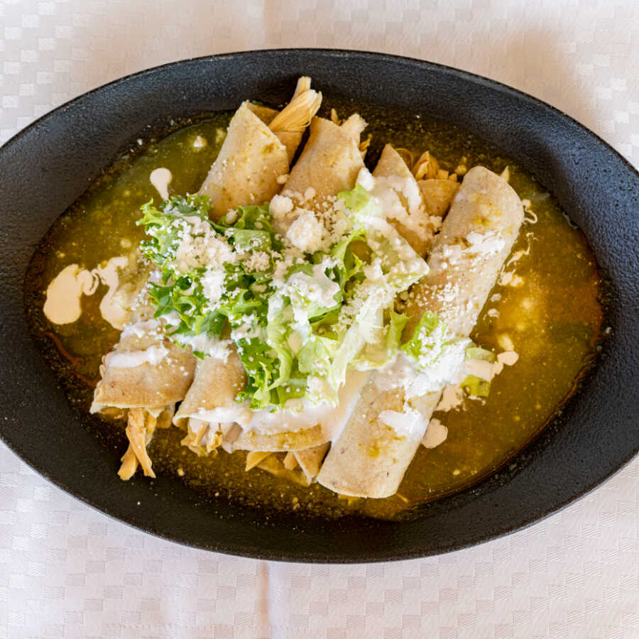 Son 4 rollos de tortilla rellenas de pollo deshebrado, la salsa te la enviamos por separado (para evitar derrames) van acompañados de lechuga, queso, crema y si gustas más proteína compleméntalas y adicionales.