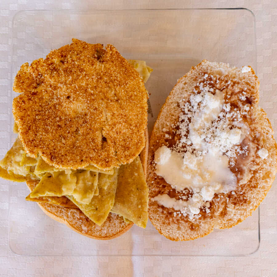 Elaborada con pan blanco, frijoles, mayonesa, salchicha, huevo, milanesa, jamón, lechuga, jitomate, cebolla y picante.