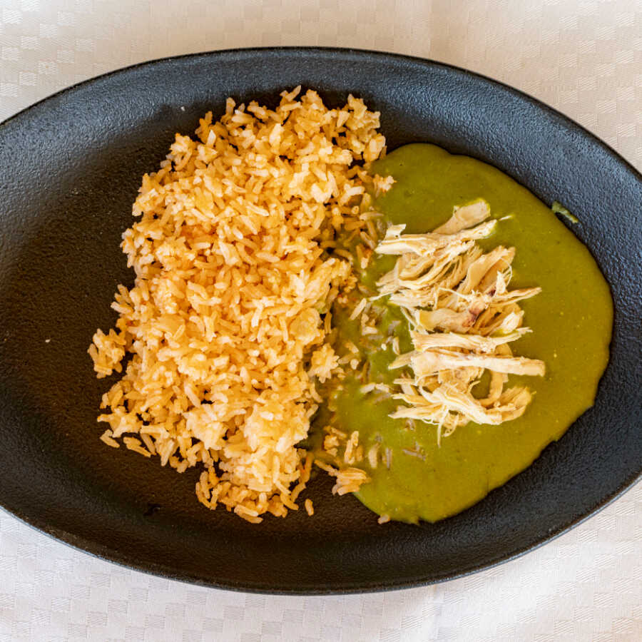 Un clásico con alma de barrio: 200 gramos de pollo deshebrado bañado en 300 gramos de mole verde espeso, hecho con hierbas frescas, pepitas y un toque de picante que no se anda con rodeos. Acompañado de 200 gramos de arroz Rojo bien esponjadito, que absorbe cada gota de sabor.