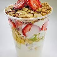 vaso de Fruta recién picada, bañada con el yogurth de tu preferencia y los topping que elijas