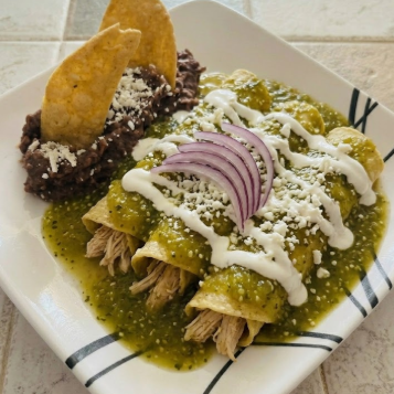 Enchiladas rellenas de pollo bañadas en salsa verde, crema y queso, con cebolla