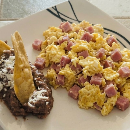 Dos piezas de huevo revuelto con jamón acompañado de frijoles refritos