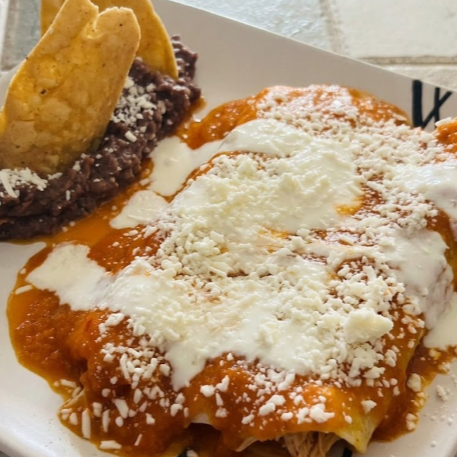 Enchiladas rellenas de pollo bañadas en salsa roja, crema y queso, con cebolla