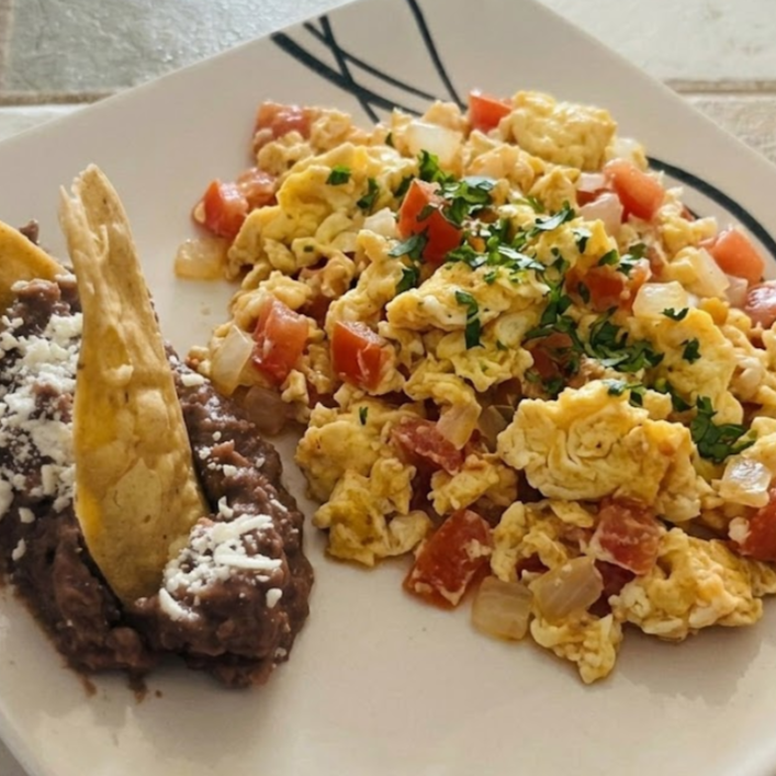 Dos piezas de huevo revuelto con jitomate y cebolla acompañado de frijoles refritos