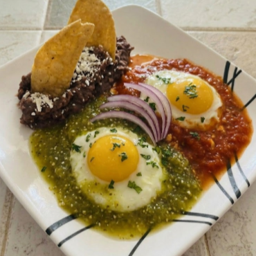 Dos piezas de huevo estrellado bañados en salsa verde y roja