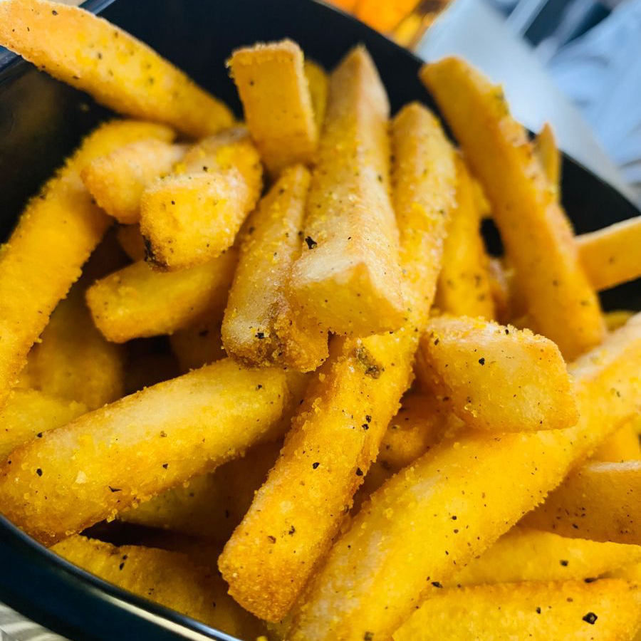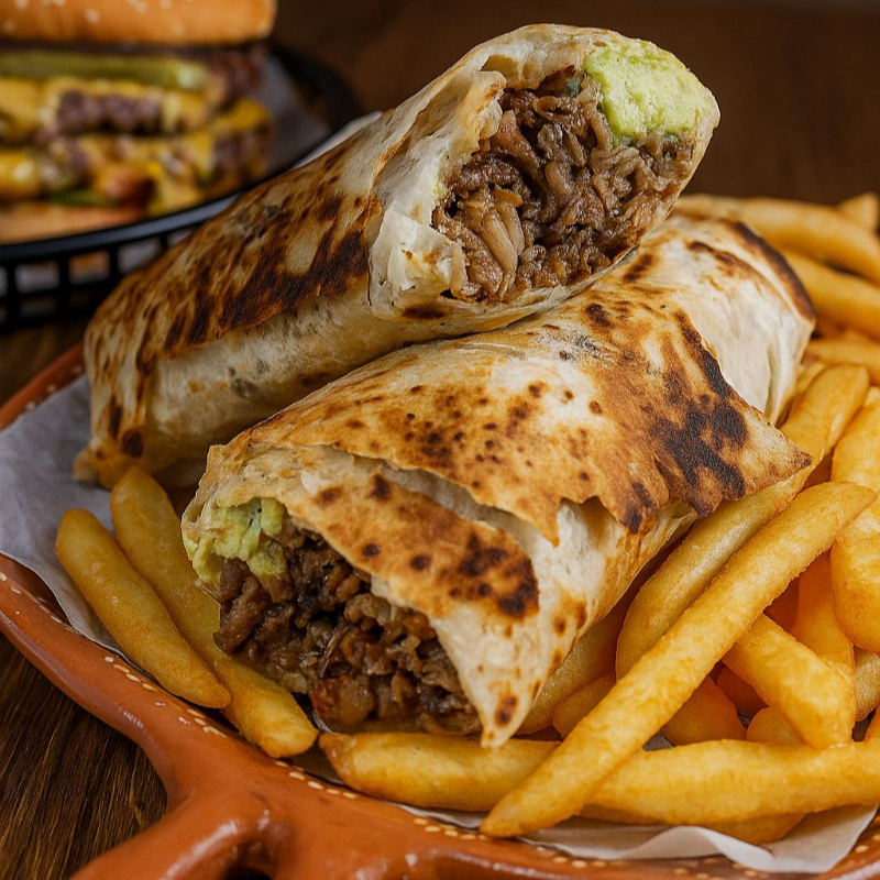 Tortilla de harina de 25cm, carne al pastor, queso manchego, lechuga, frijoles, jitomate y jalapeños. Acompañado de una porción de papas a la francesa.