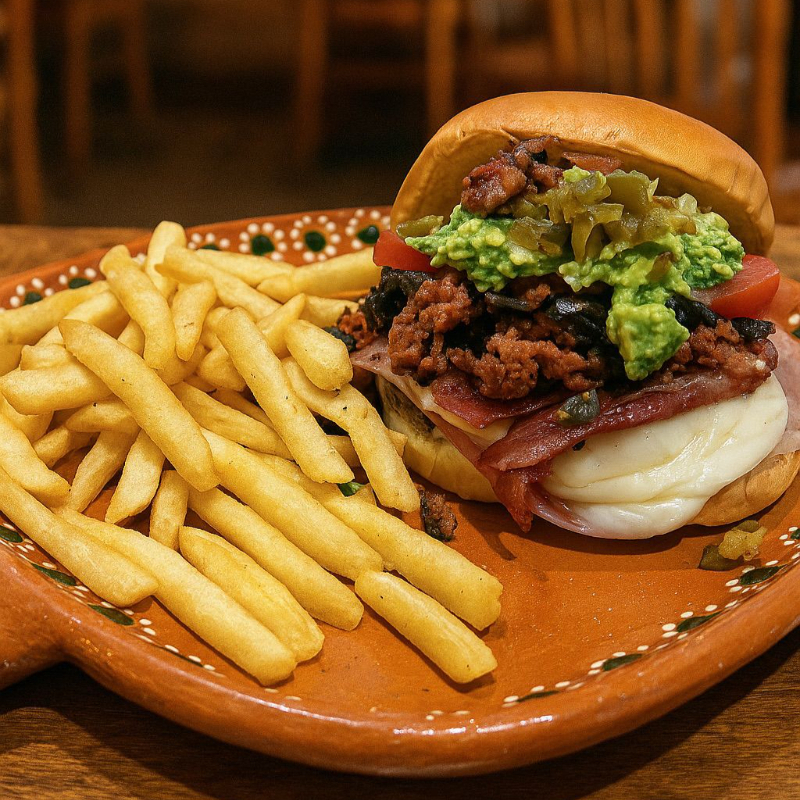 Carne de res, guacamole, chorizo, lechuga, queso manchego, jamón, cebolla, jitomate, tocino y aderezos. Lleva una porción de papas a la francesa.