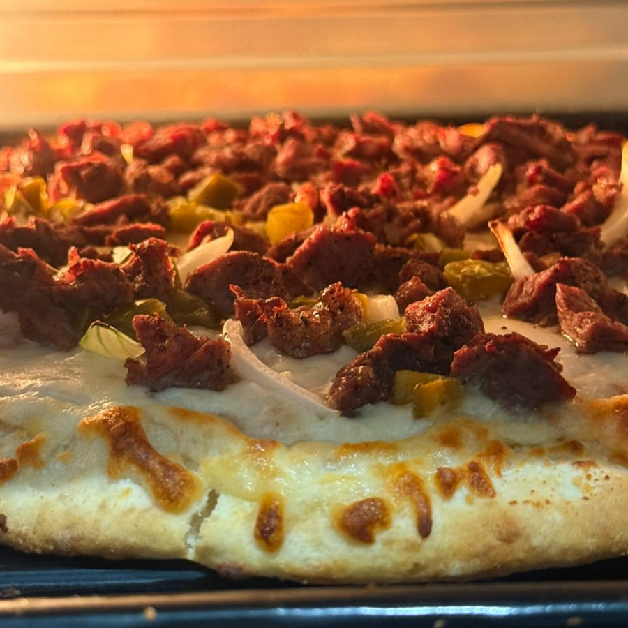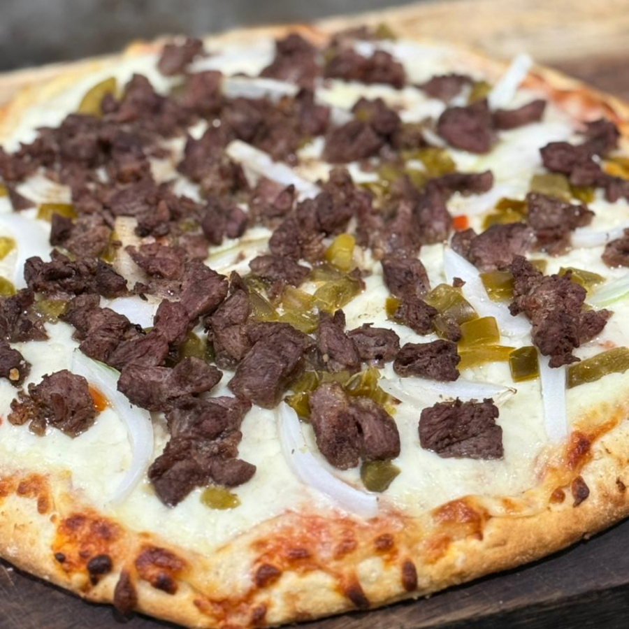 Salchicha de res, porción de peperoni, salsa de tomate, piña, queso manchego, cebolla, jitomate, jalapeño y aderezos