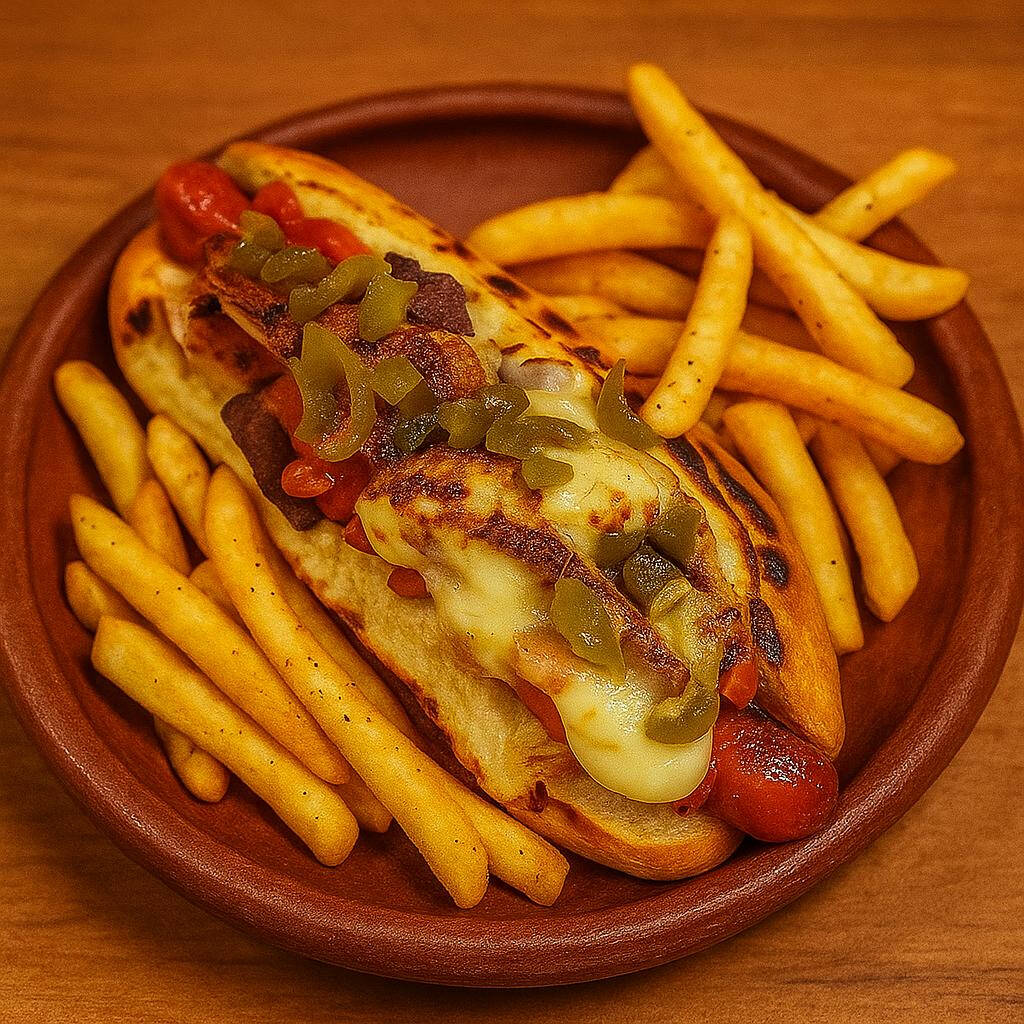 Salchicha de res, cebolla, jitomate, jalapeño y aderezos