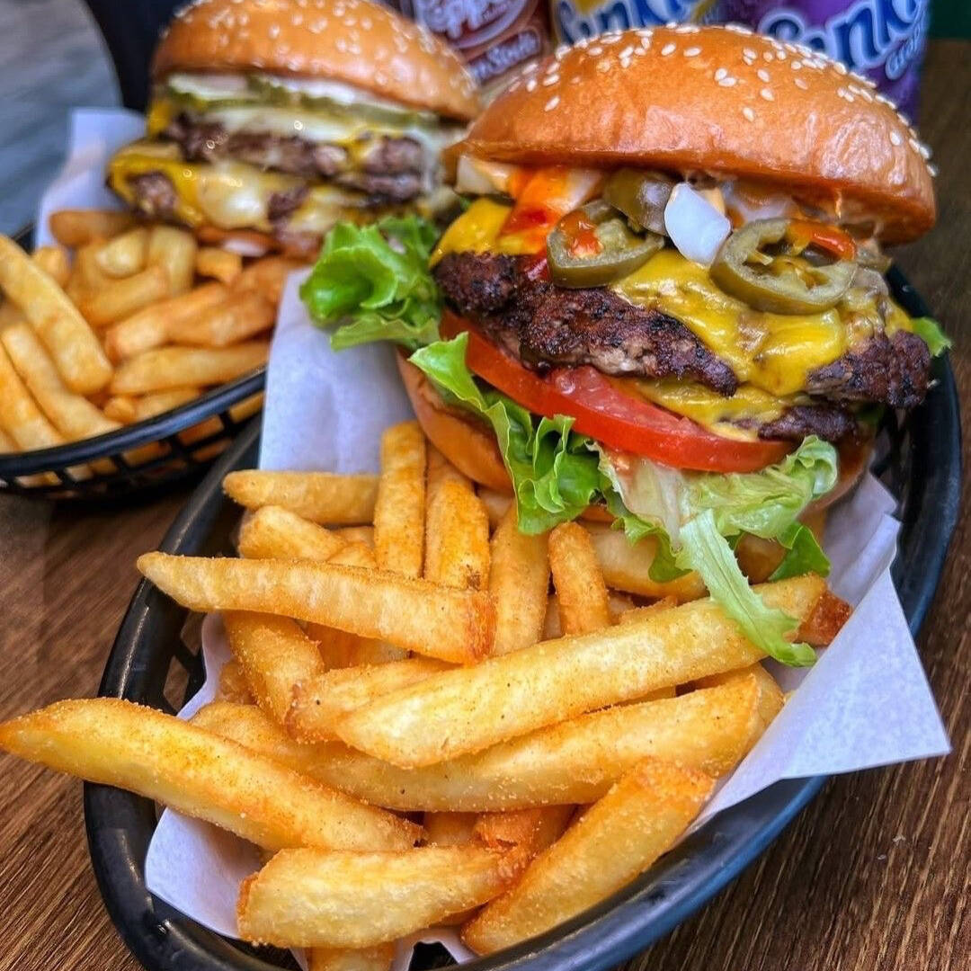 Doble carne de res, lechuga, queso manchego, jamón, cebolla, jitomate, tocino, piña y aderezos. Lleva una porción de papas a la francesa.