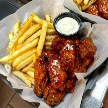 Tortilla de harina de 25cm, pechuga asada, queso manchego, lechuga, frijoles, jitomate y jalapeños. Acompañado de una porción de papas a la francesa.