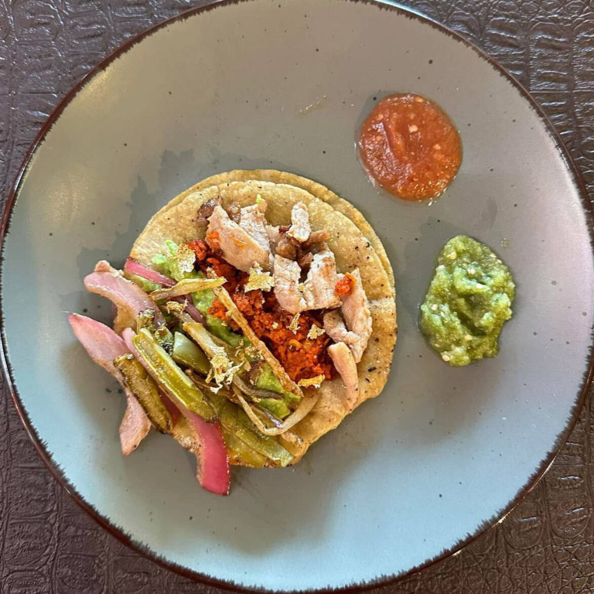 Dos tortillas de maíz no.12 carne al pastor, cebolla caramelizada y nopales.