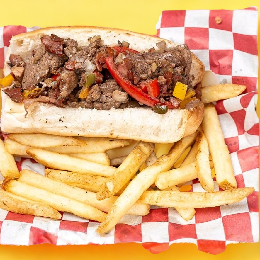 Deliciosa carne de cerdo marinada en salsas negras gratinada con queso y papas a la franesa con mayonesa chipotle entre dos tortillas de harina