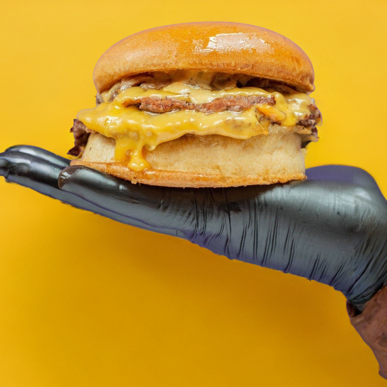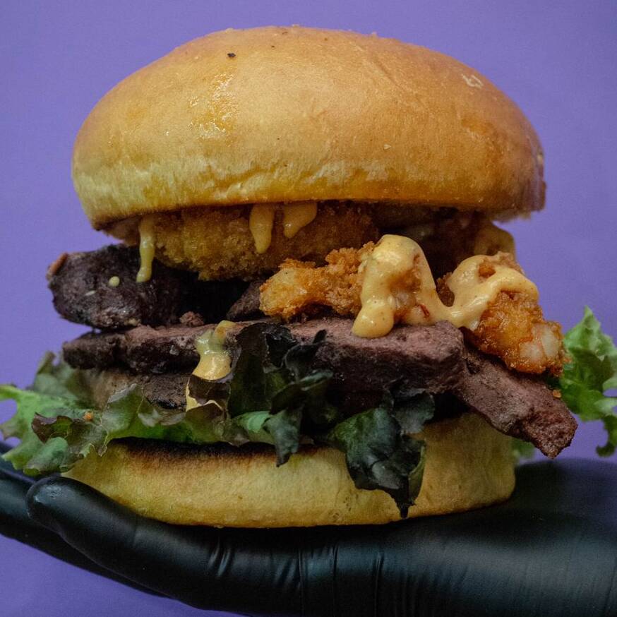 100gr de carne angus estilo smash cubierta con queso cheddar, 100gr de arrachera de res, camarones empanizados, aderezo de cilantro jalapeño, mayonesa chipotle, chiles y pepinillos