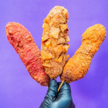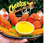 150gr de carne de res empanizada con Takis fuego, bañada en queso de nachos, coronada con Takis fuego, aderezo, chiles y pepinillos