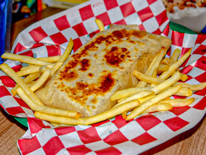 Burrito de bistec de cerdo marinado con salsas negras acompañado de papas a la francesa (por dentro ) y aderezo de chipotle
