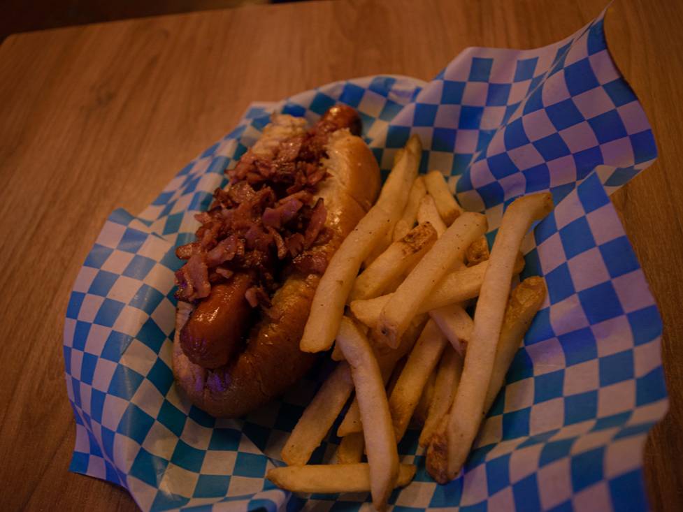 Salchicha frankfurt bañada en chilli acompañado de lechuga, aderezo, chiles y pepinillos
