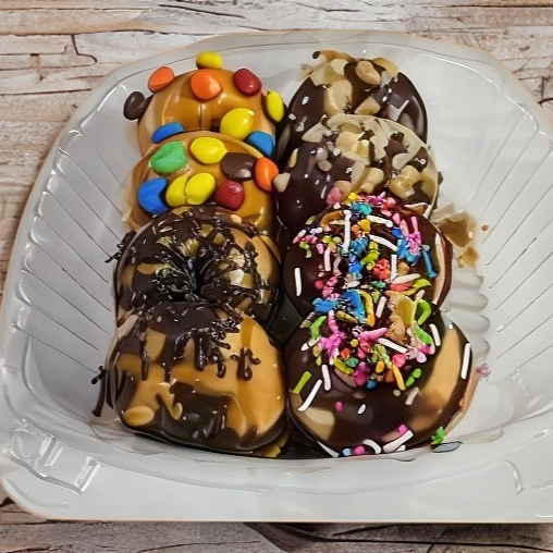 8 piezas bañadas con dulce de Leche y Chocolate Hershey´s y de toppings: Granillo, Nuez, M&M minis.