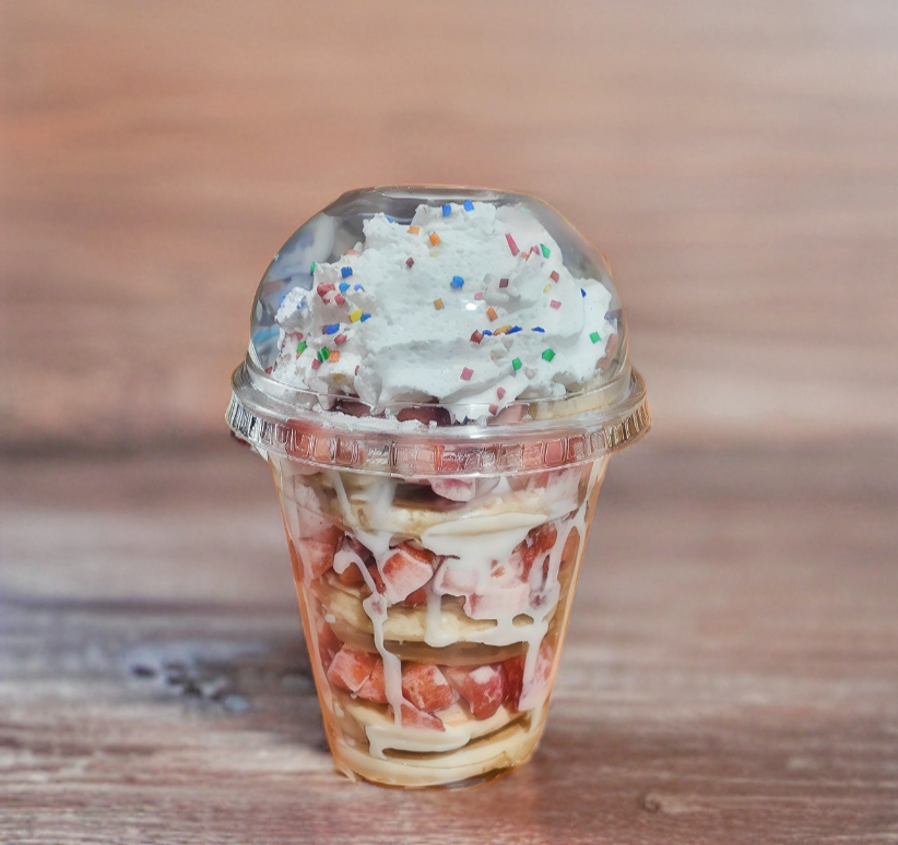 9 Piezas de mini hot cakes con fresa y un topping a elegir: lechera, chocolate líquido, miel de maple.