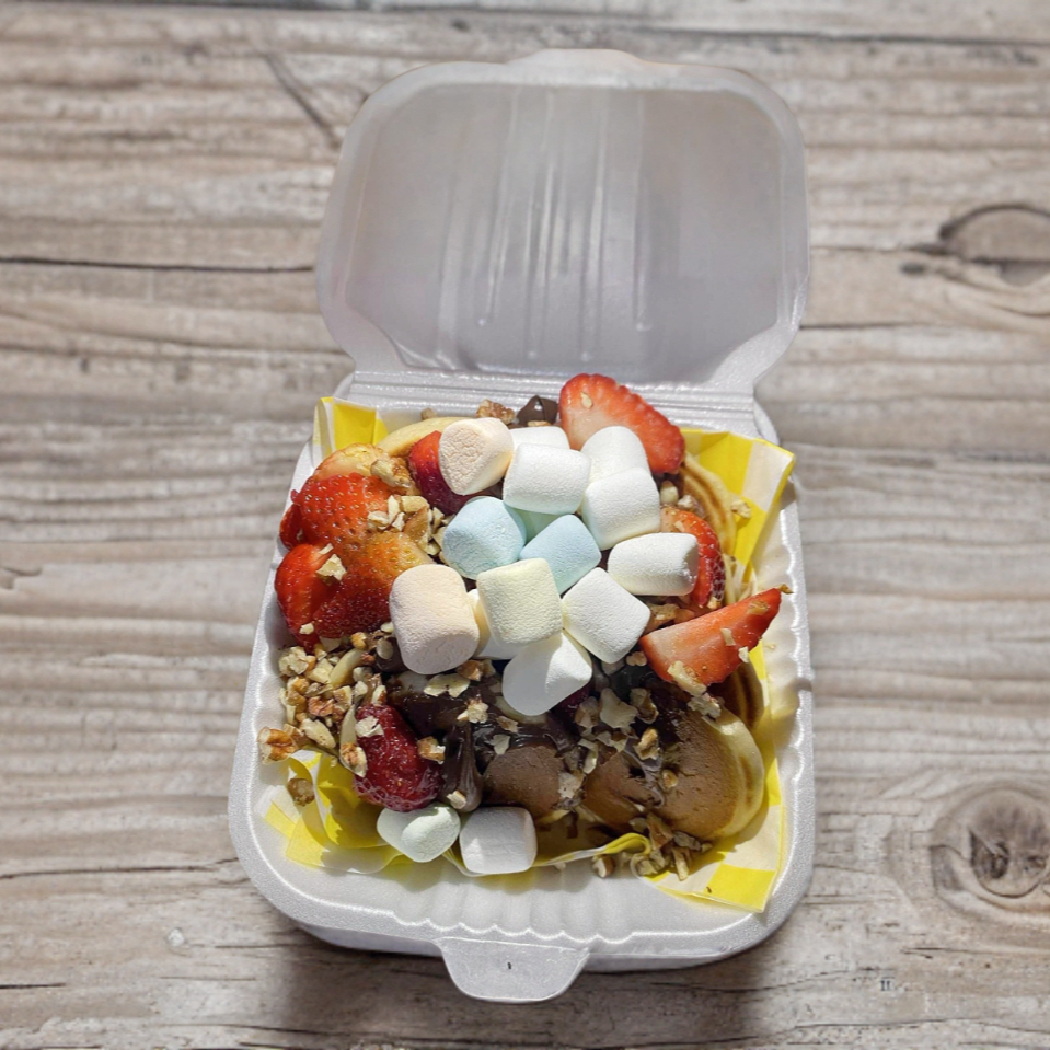 4 mini waffles, fruta, untable, un topping