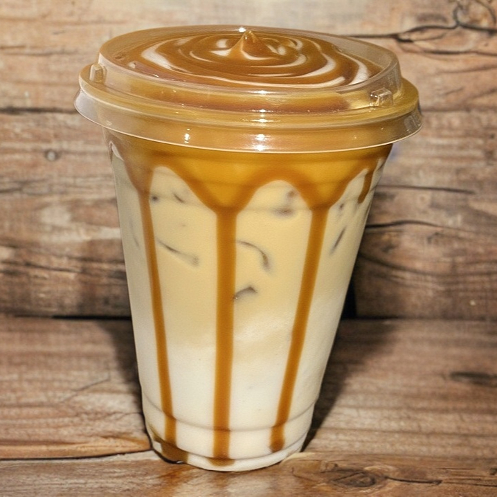 leche de tu preferencia, 2onz de expreso de café, caramelo, hielo.