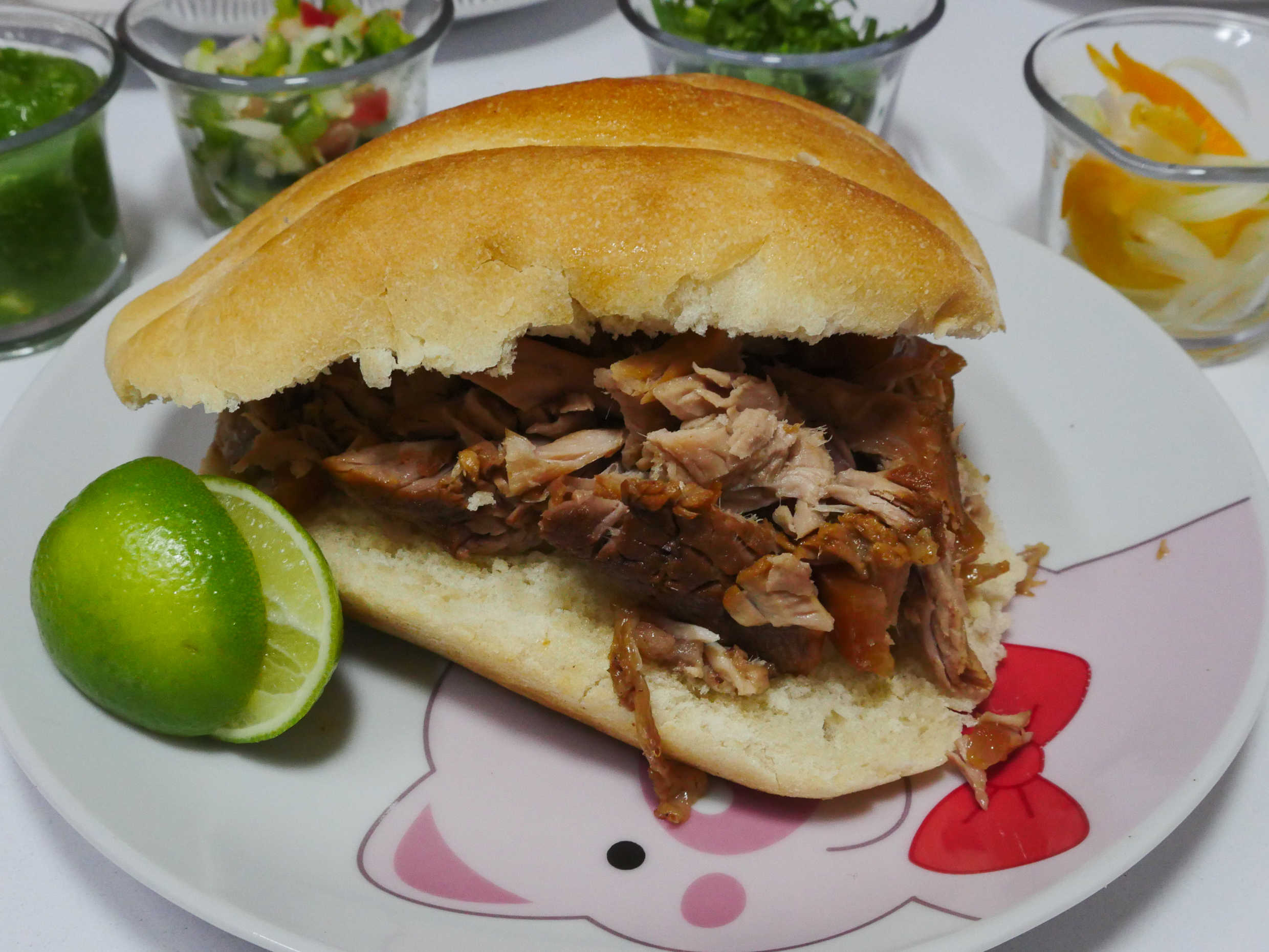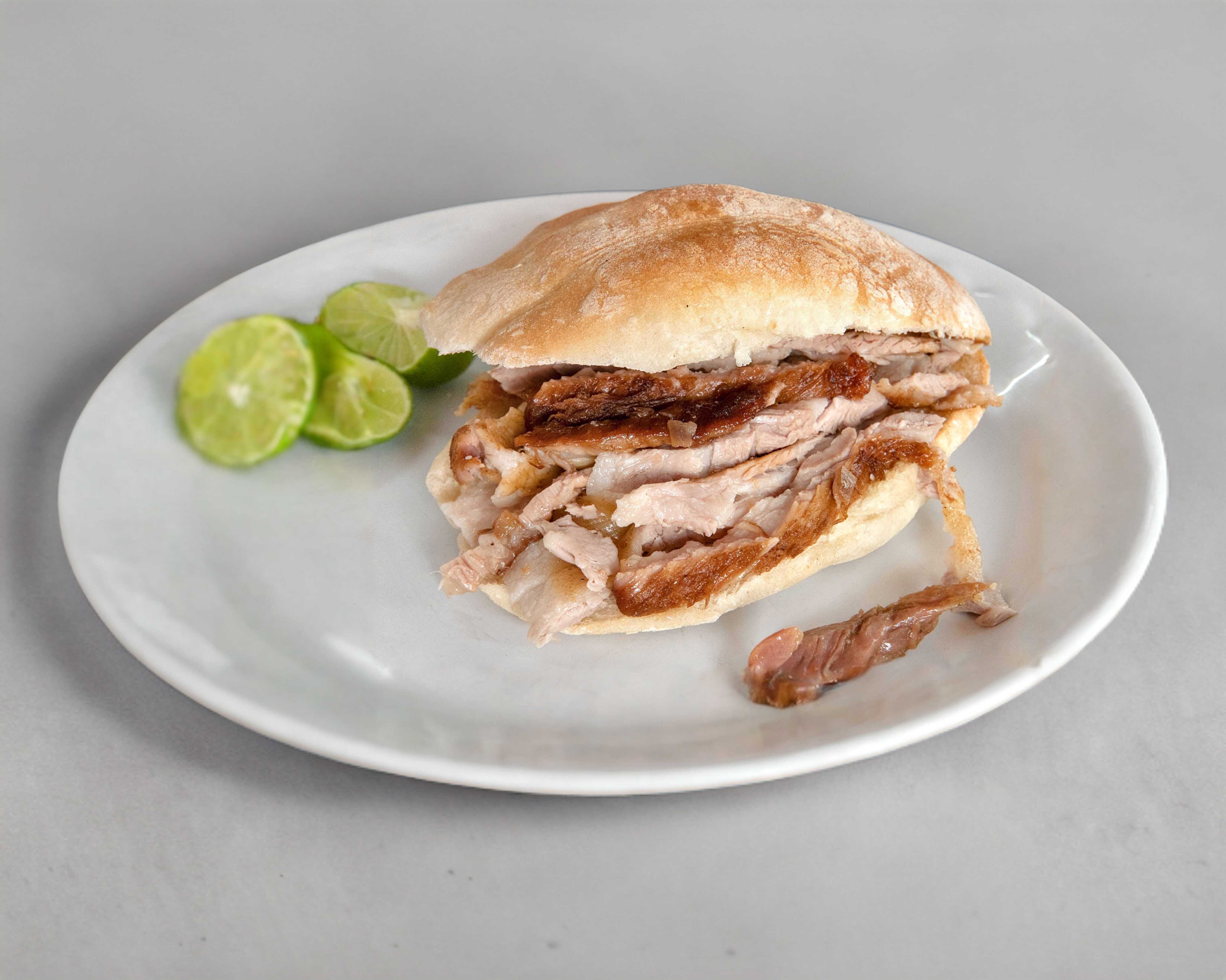 Pan de telera dorado, relleno con 80 g de carnitas campechanas (maciza y cuerito), acompañado de vegetales frescos y salsas de la casa al gusto. Ideal para una persona.