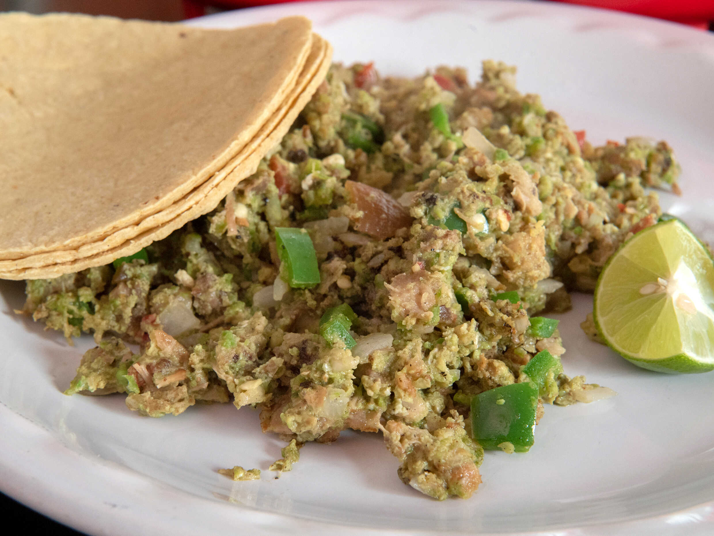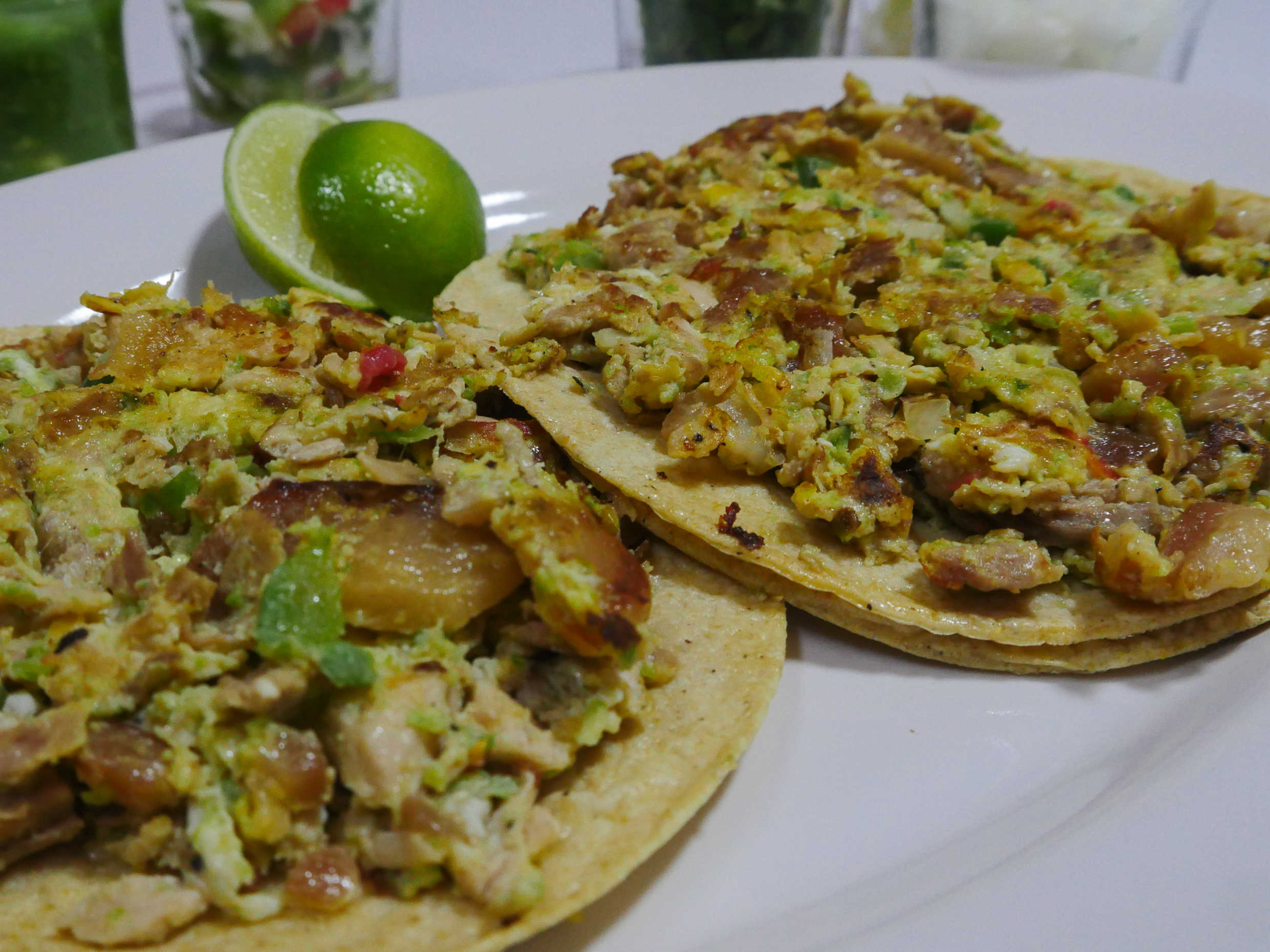 Carnitas con huevo y salsa a la plancha.