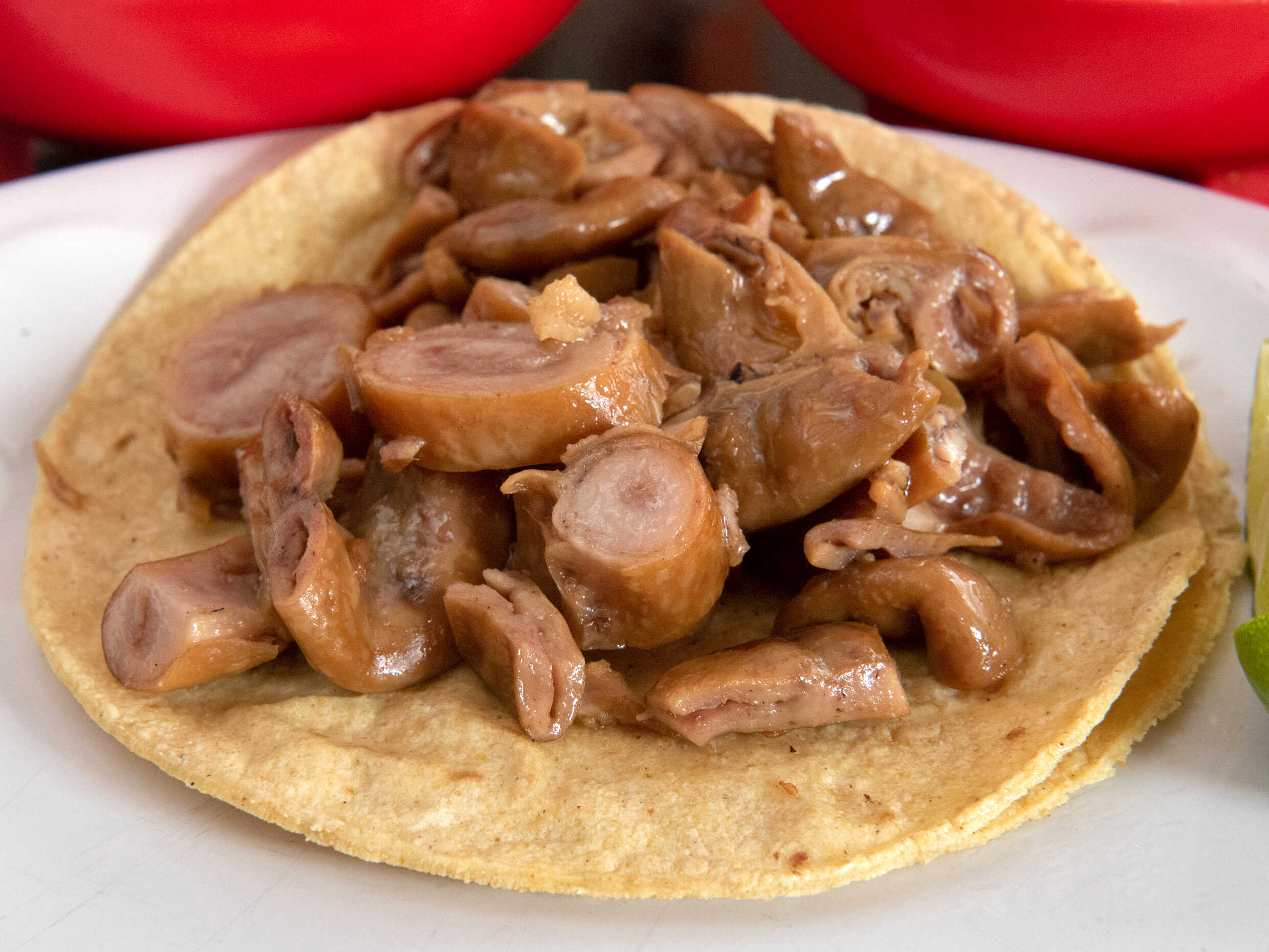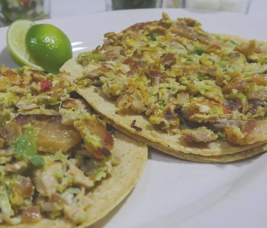 2 Tacos revolcados, (100 gramos por taco) Carnitas, huevo y salsa a elegir. (Personal)