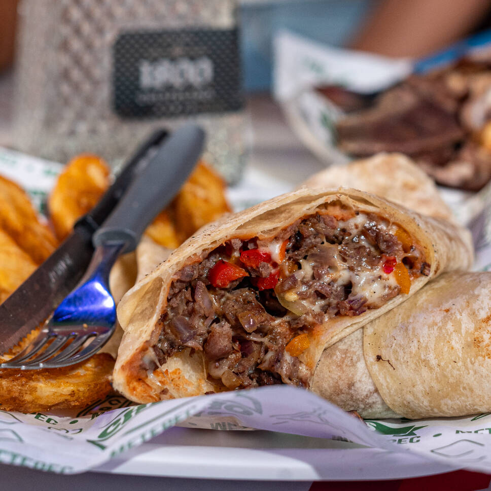 Tortilla de harina, arrachera, frijoles, pimiento morron, cebolla cocida queso, acompañado de 100 g de papas fritas.