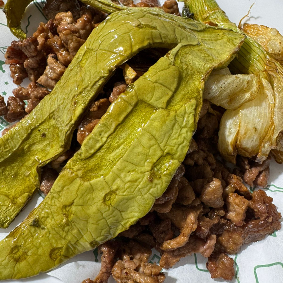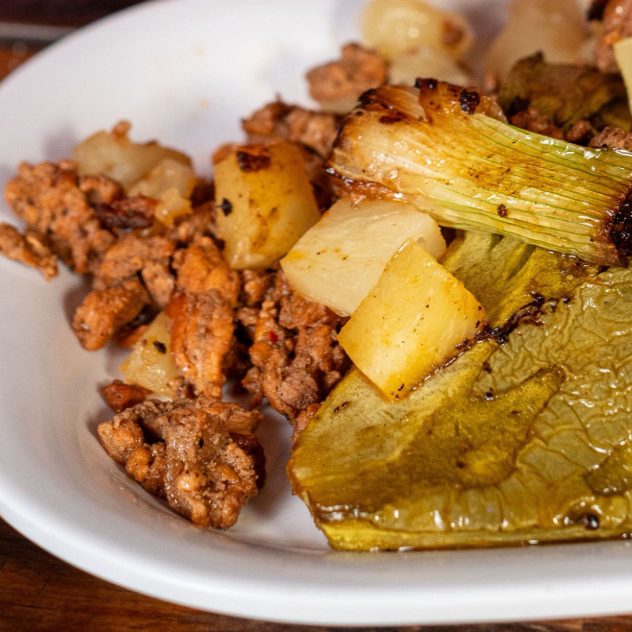250 gr de pechuga de pollo acompañada de nopal y cebollas asadas. incluye tortillas, salsa y limones.