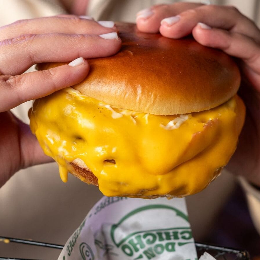 Clásica hamburguesa, carne y queso cheddar.