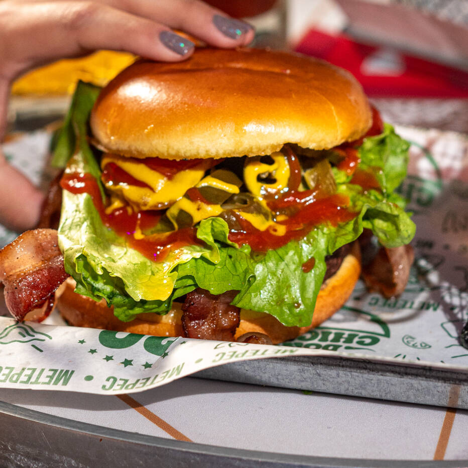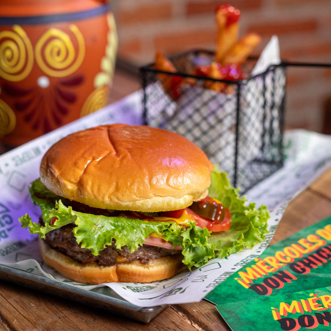 Doble carne de res, lechuga, jitomate, pepinillos, jamón, queso, mayonesa, mostaza y catsup, con 100 g de papas gajo.