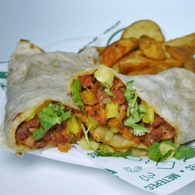 tortilla de harina, carne al pastor, frijoles, pimiento morron, ceboola cocidan queso. acompañado de 100 gr de papas fritas