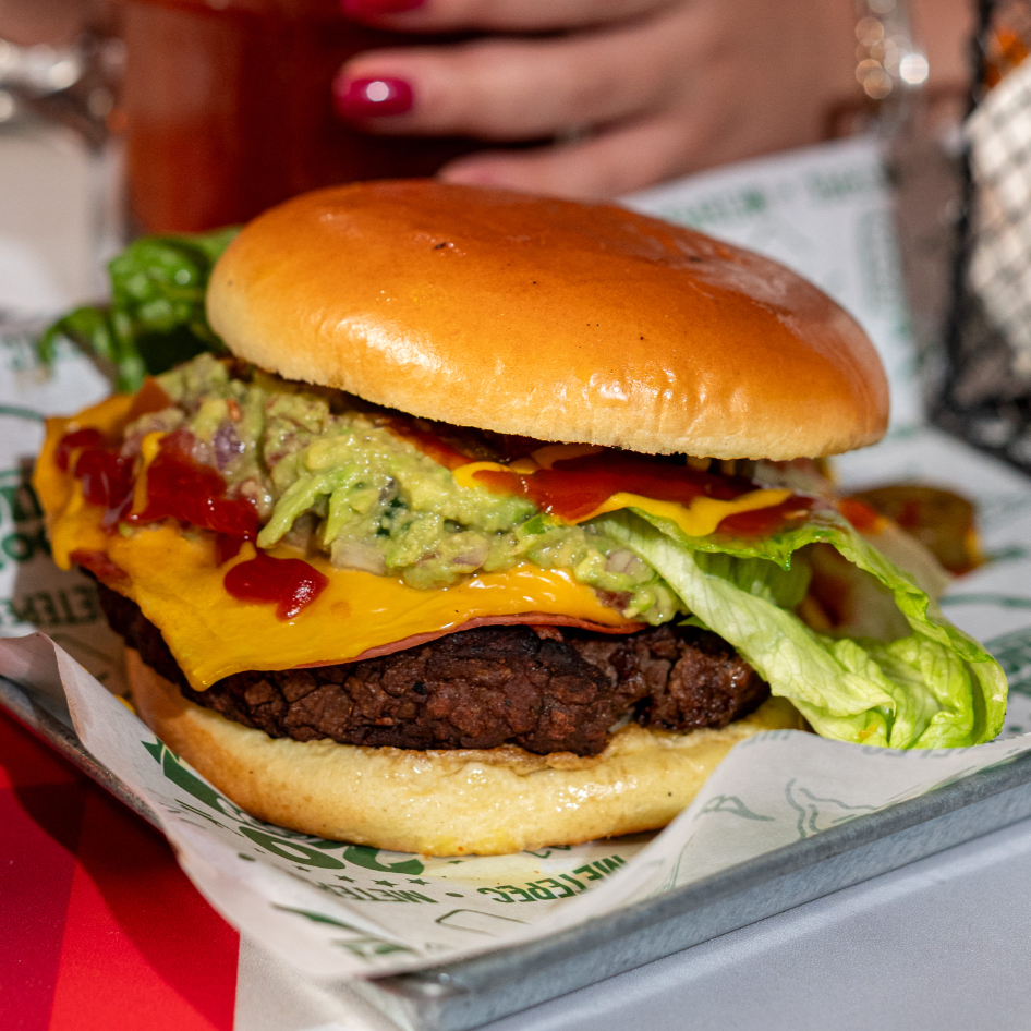 Hamburguesa de res, jamón, queso y guacamole.