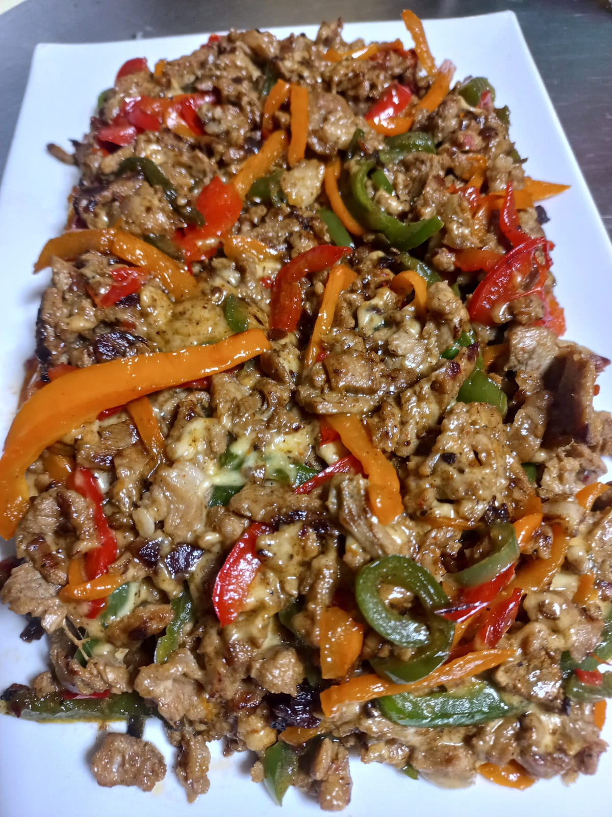 Platillo personal. Deliciosa carne con queso gratinado, frijoles y pico de gallo 17 centímetros de largo. Incluye aparte, limones, cebolla, cilantro, salsa verde y roja.
