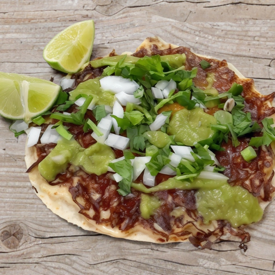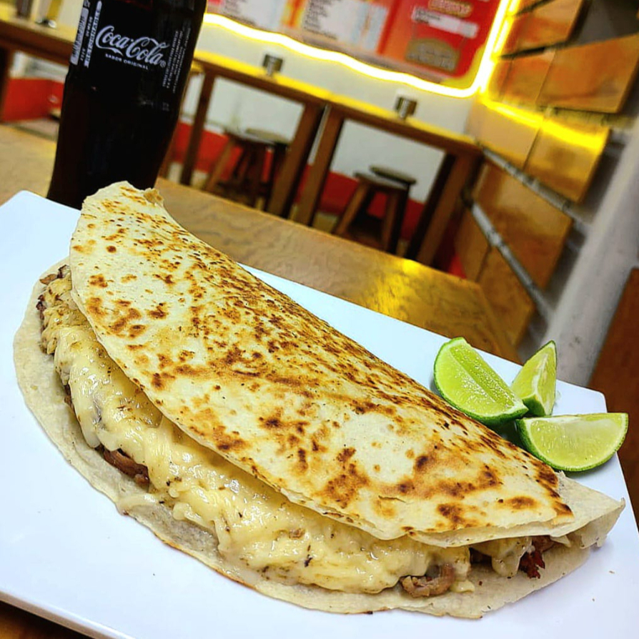 Tortilla de harina, carne de su elección y una capa de queso manchego ligeramente quemada. Incluye aparte limones, cebolla, cilantro, salsa verde y roja.