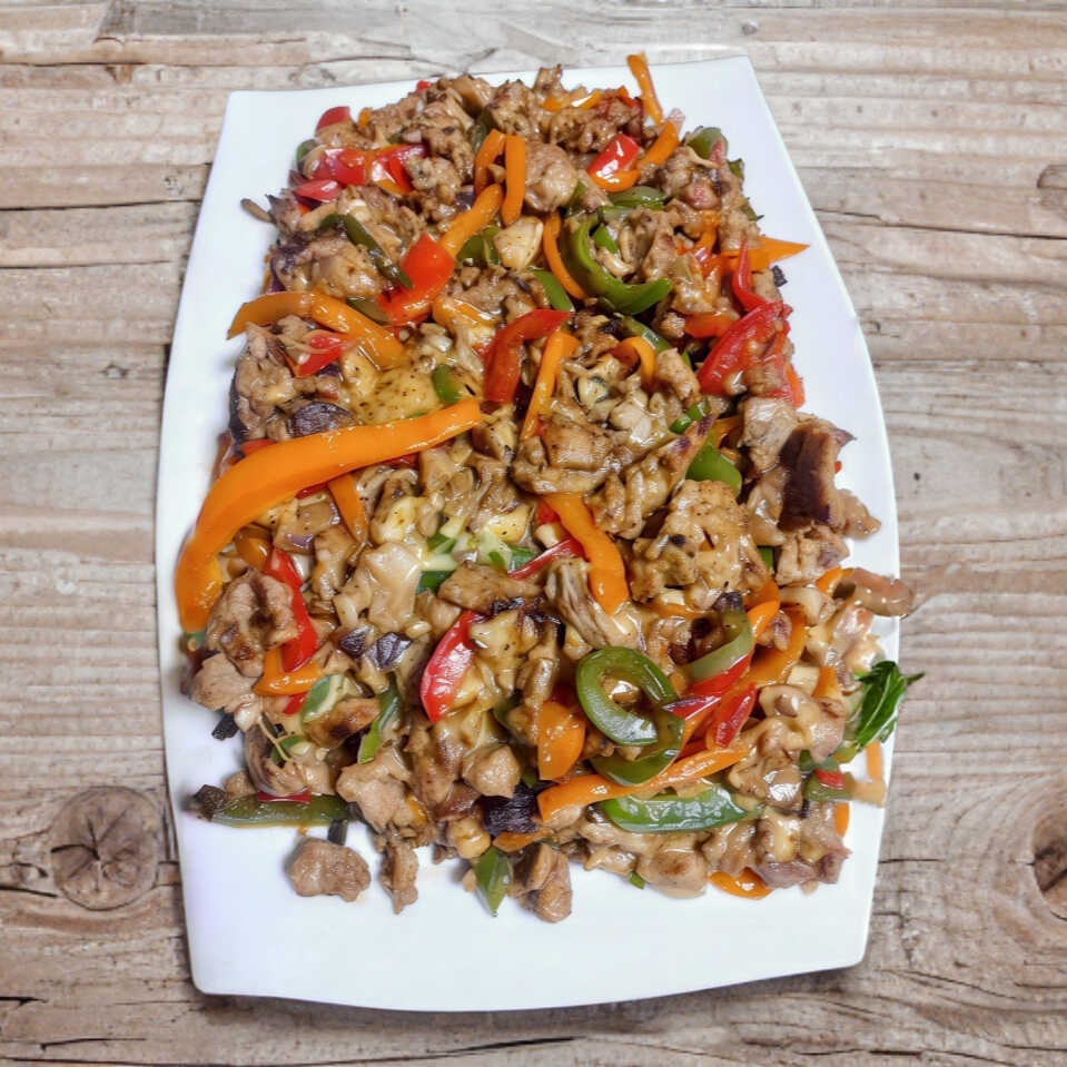 350 g De carne fresca pesada en crudo, cuidadosamente seleccionada, chile morrón, cebolla y tocino, se prepara a la plancha para brindarle textura y calidad.