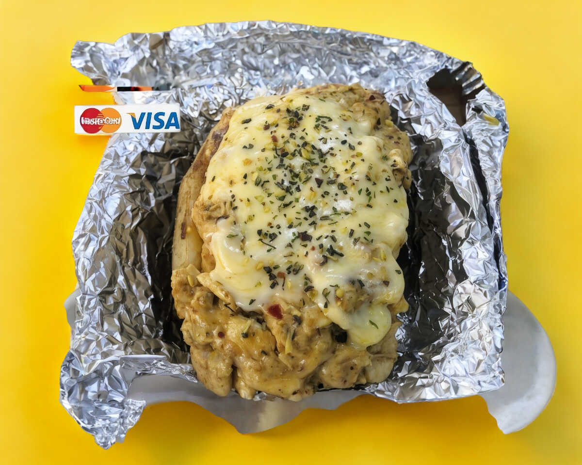 Papa al horno rellena de carne con queso, sazonada con especies. Incluye aparte limones, cebolla, cilantro, salsa verde y roja.